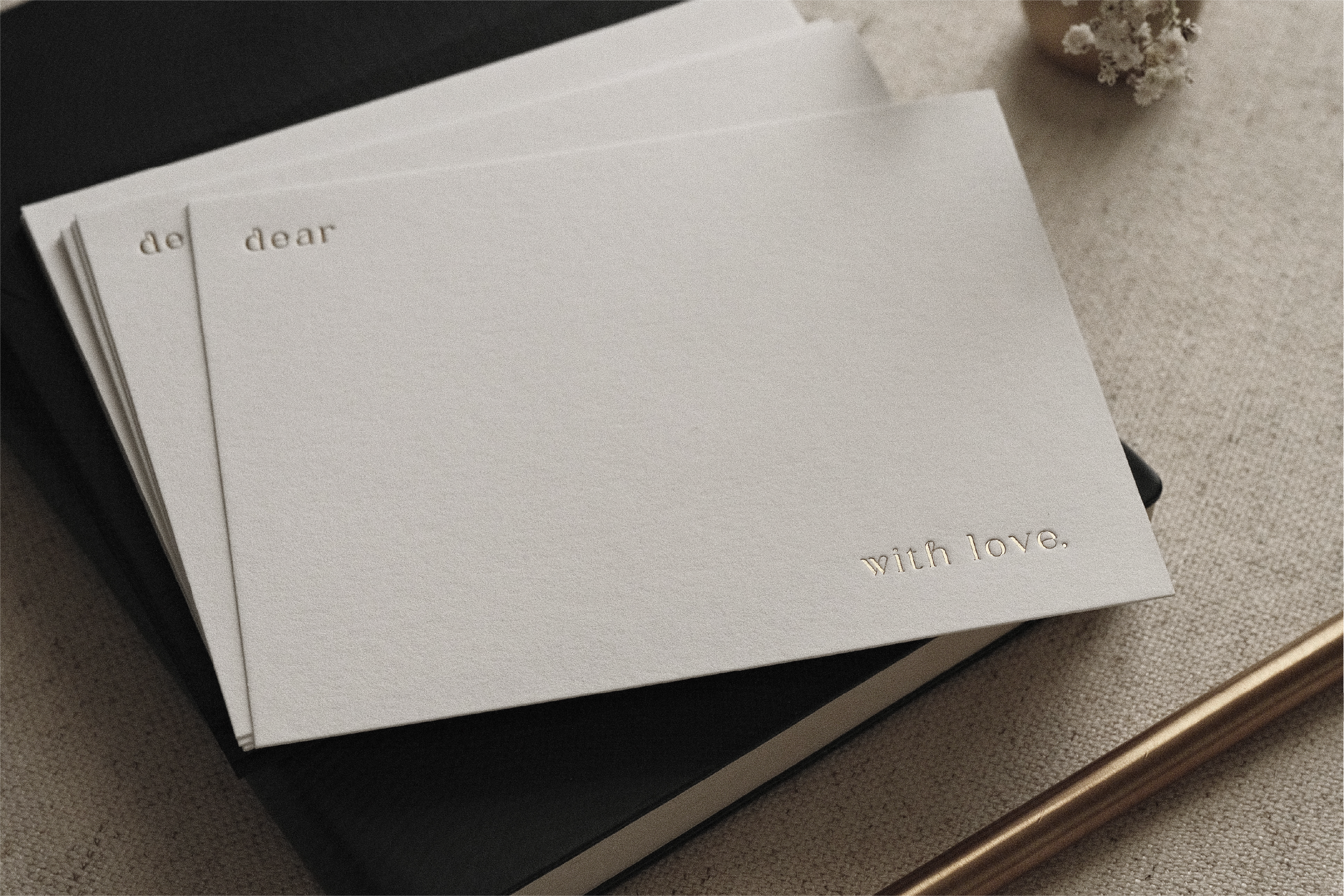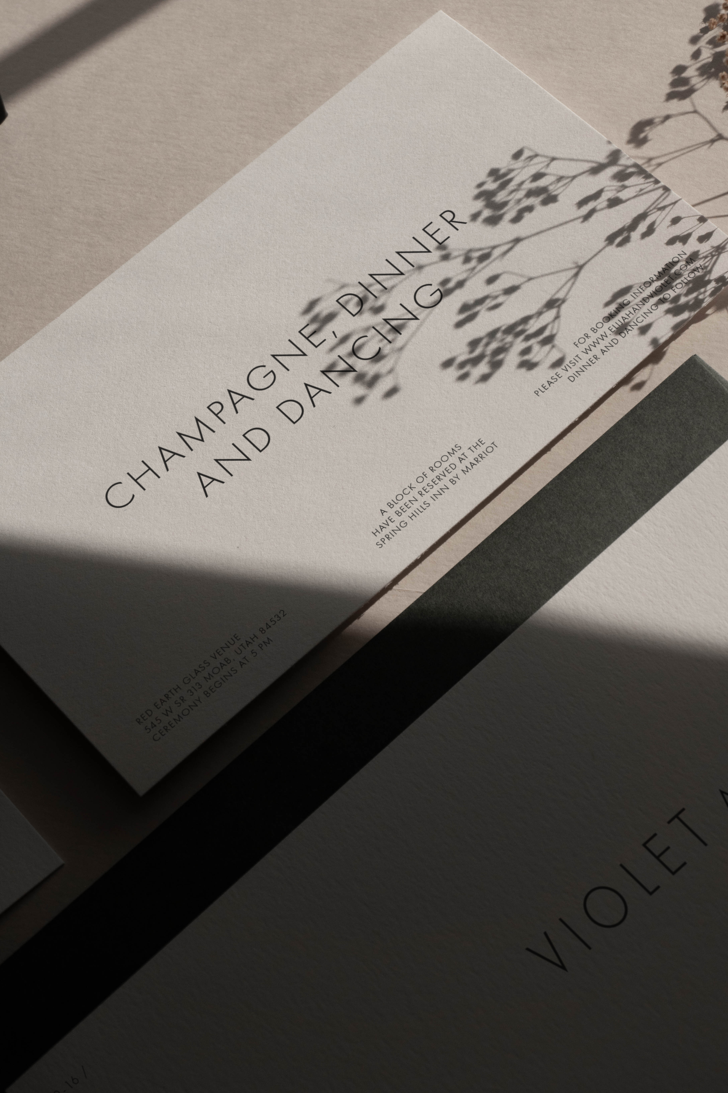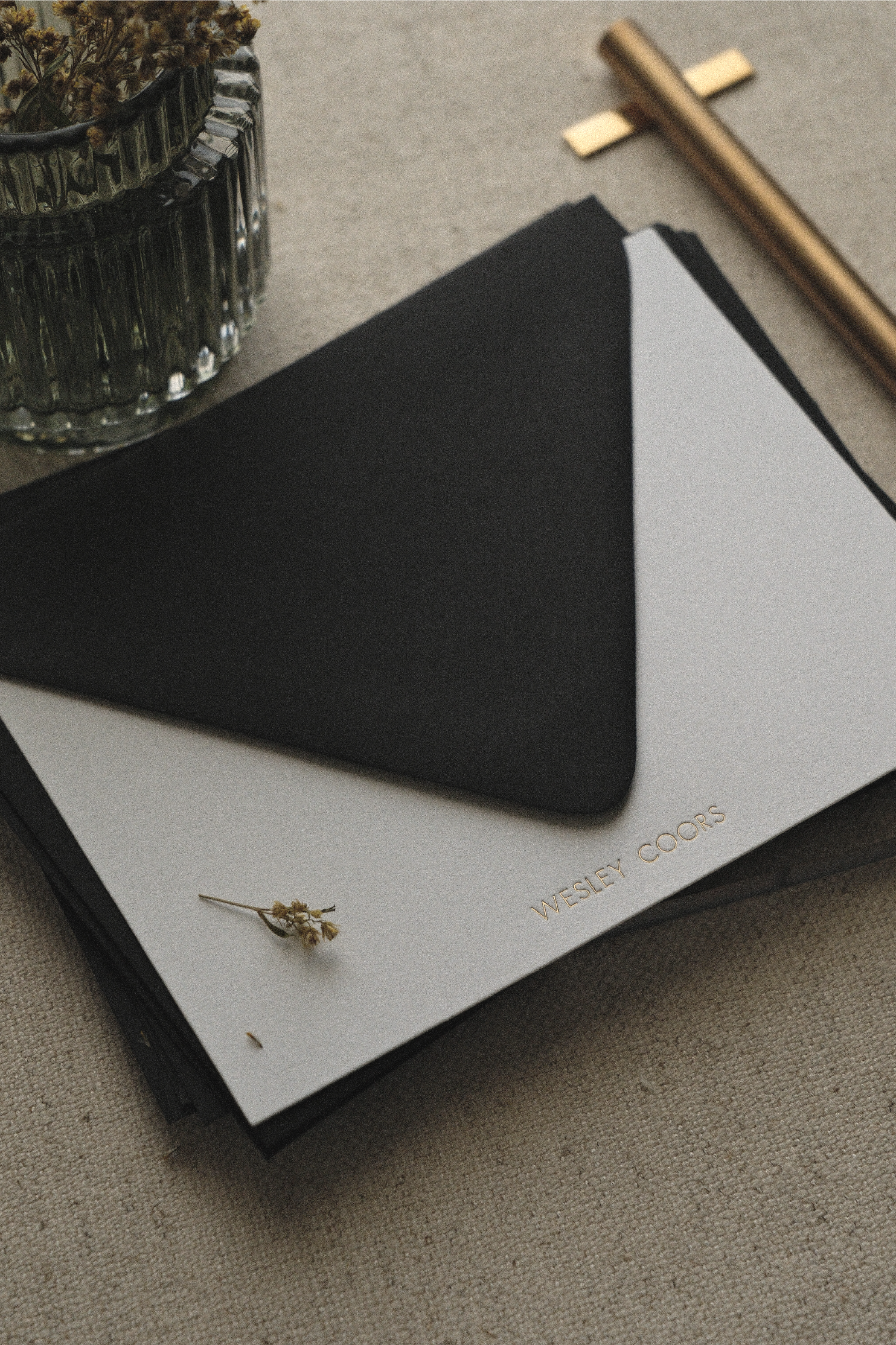 Muted Slate is a small boutique design and print studio specializing in wedding invitations and personal stationery. Our aesthetic is defined by sophistication, minimalism, and timeless elegance, brought to life through rich textures, refined typography, and muted palettes. We work with fine paper stocks and luxe print methods to create stationery that feels truly elevated.